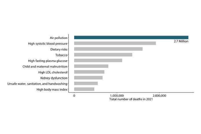 Air pollution is a leading environmental risk factor for poor health worldwide. In India, exposure to air pollution accounted for nearly 18 percent of all deaths in 2021, more than 2.1 million deaths, and 62.7 million healthy years of life lost. Among the top five risk factors for poor health in India, air pollution ranks first, followed by high blood pressure, dietary risks, tobacco use, and high fasting plasma glucose. Children are particularly vulnerable to exposure to air pollution. In 2021, India saw the highest total number of deaths (169,400 deaths) in children under five due to air pollution.